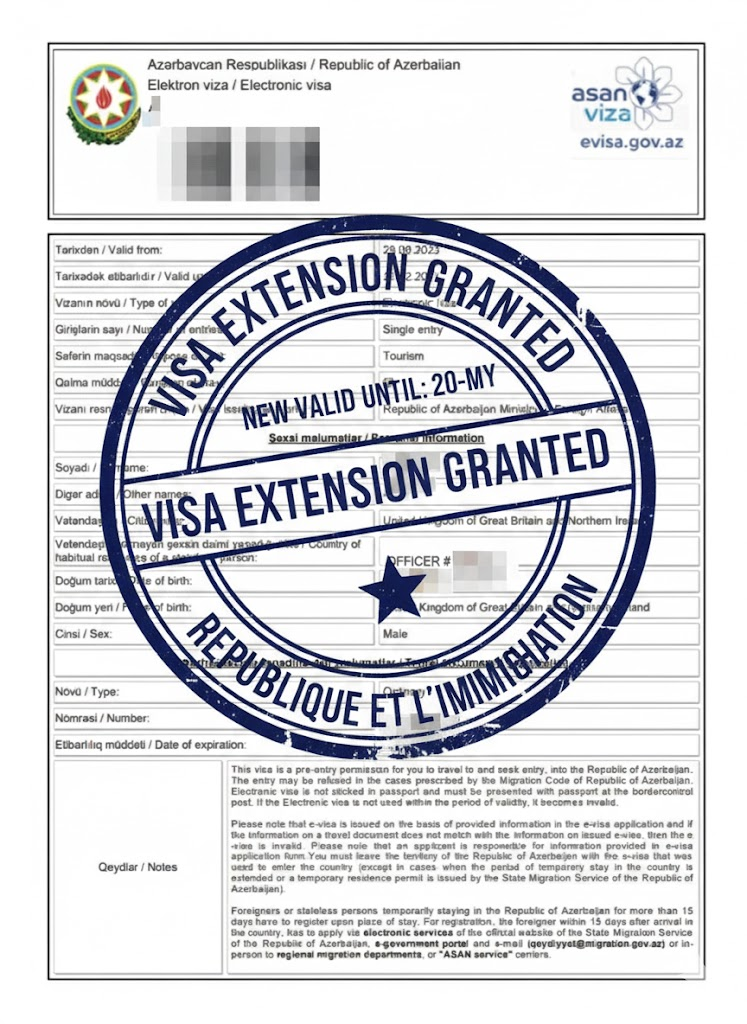 Extending an eVisa while inside Azerbaijan is difficult and generally only allowed for humanitarian reasons or severe illness. If you wish to stay longer than 30 days, you should consult the State Migration Service immediately upon arrival, but do not count on an extension for tourism purposes.