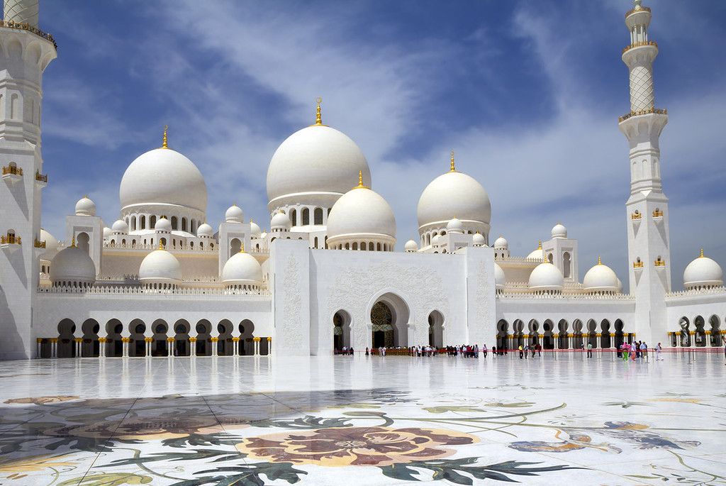 The Grand Mosque is one of the world's most impressive buildings. White marble looks stunning against the sky. Flower designs and writing cover every surface inside. Large chandeliers light up the prayer halls. The building holds thousands of people during special times.