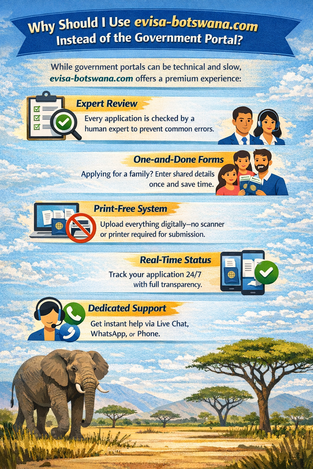 While government portals can be technical and slow, evisa-botswana.com offers a premium experience:
