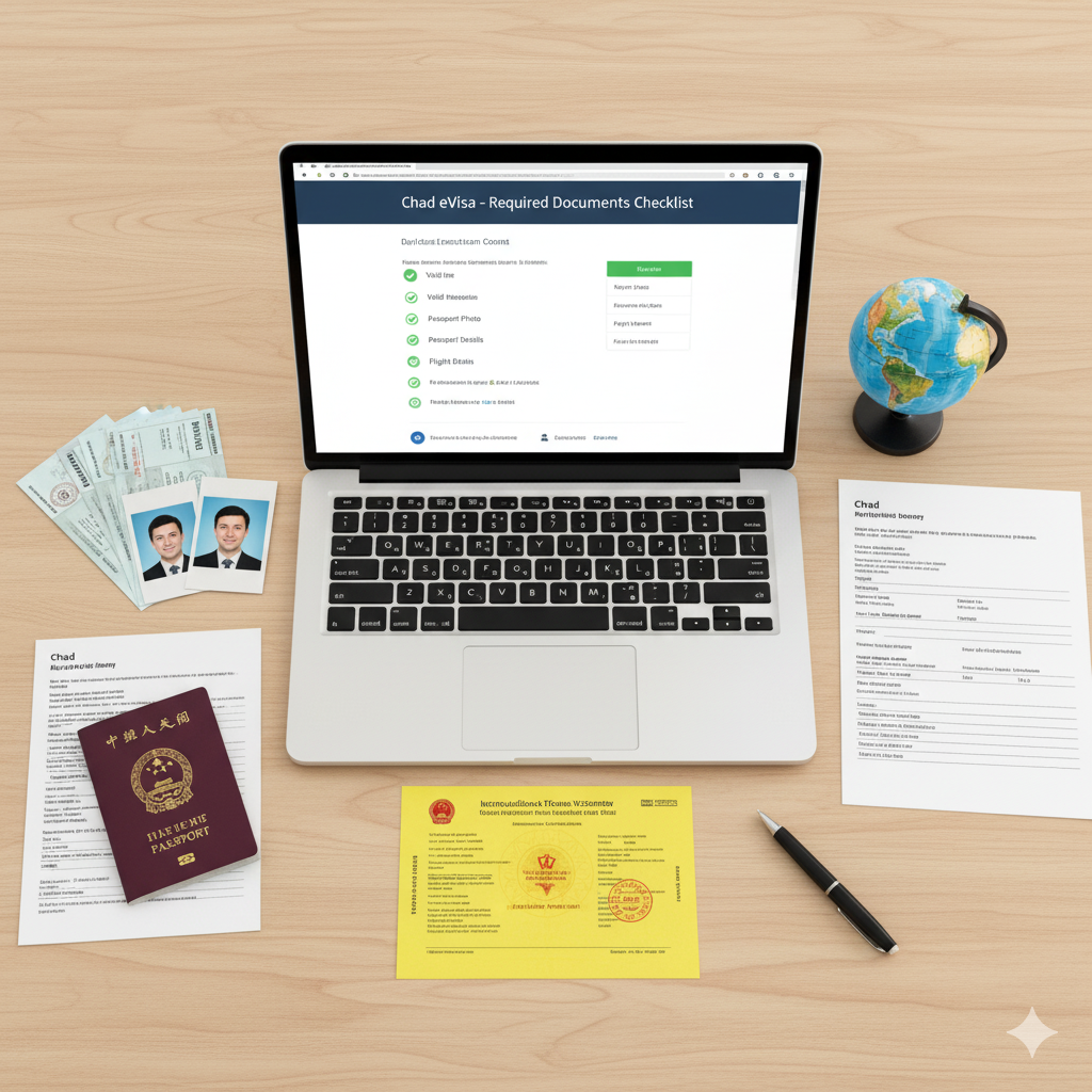 To apply for a Chad eVisa, travelers need a valid passport with at least six monthsâ validity and two blank pages, two recent passport-size photos, a yellow fever vaccination certificate, a completed and signed application form, three months of bank statements as proof of funds, and a confirmed round-trip flight itinerary.
