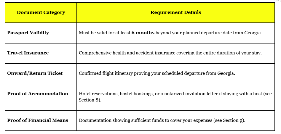 Even though the travel is visa-free, Georgian border officials will require you to present several documents to confirm the purpose of your trip and your intention to leave:
