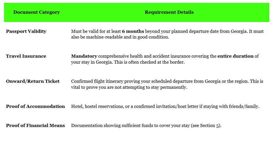 While travel is visa-free, Georgian border officials maintain strict control over entry and will require specific documentation upon arrival to ensure compliance with the law. The essential documents you must prepare and carry with you include: