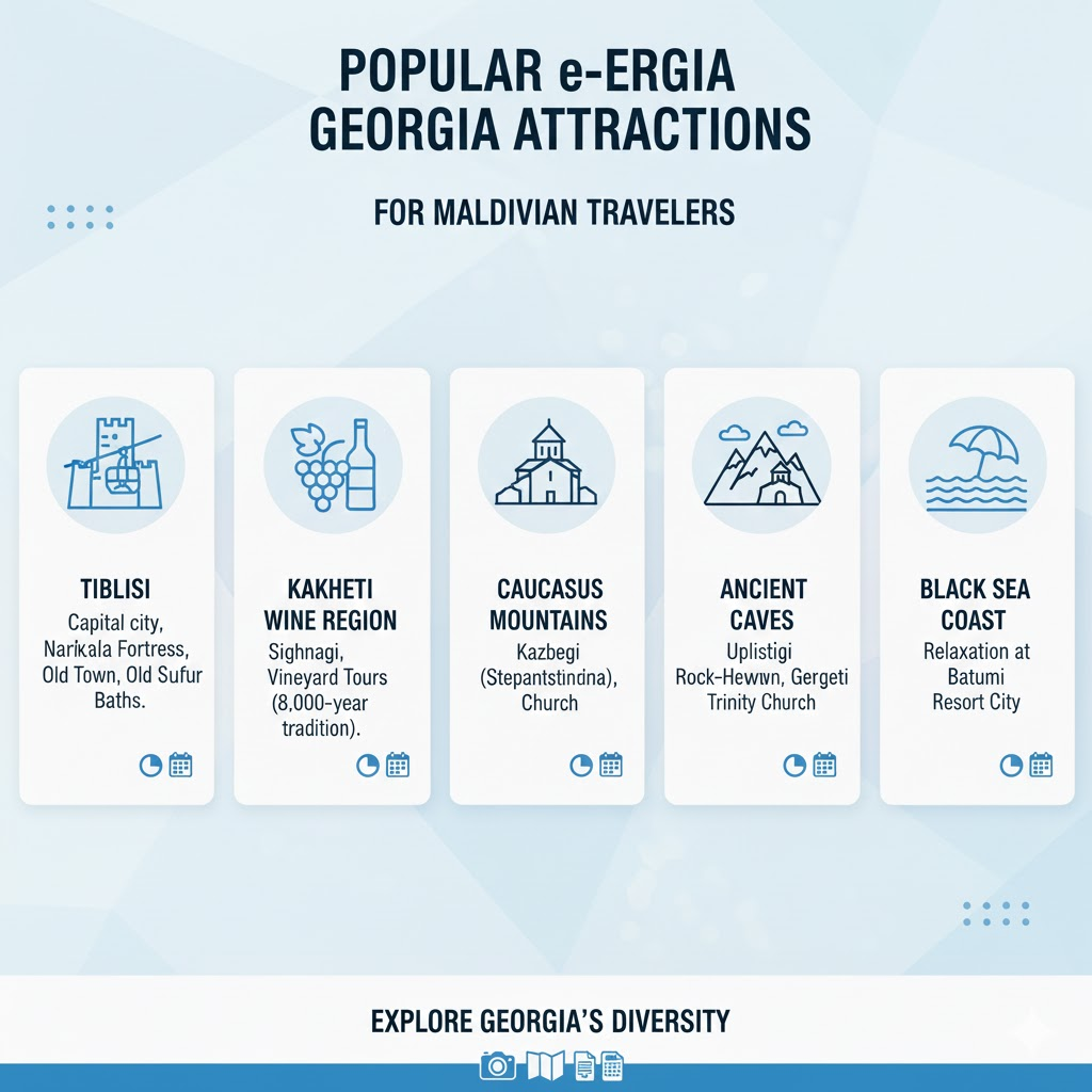 Georgia offers breathtaking diversity. Popular activities and sites for Maldivian travelers include:
