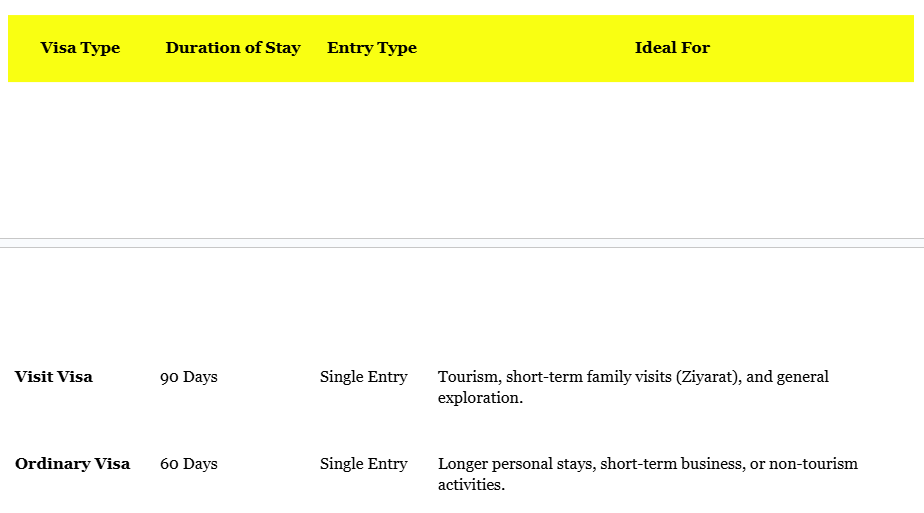 Important Note: Applicants for Pilgrimage (Ziyarat) may often apply under the Visit Visa category, but always check if group visas or specific pilgrimage visas are offered by your travel organizer, as requirements may vary.