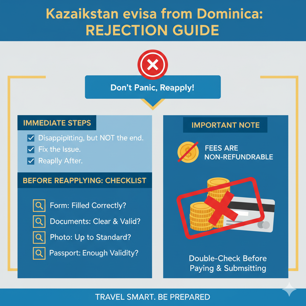 A rejection can be disappointing, but itâs not the end of your travel plans. If your Kazakhstan eVisa application gets denied, donât panic â you can reapply after fixing the issue.