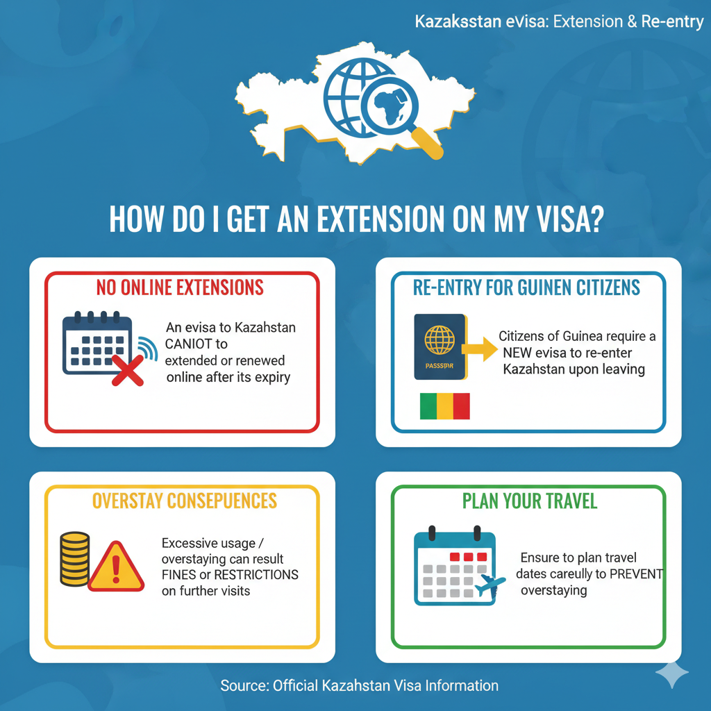 The citizens of Guinea are required to seek a new eVisa in case they desire to re-enter Kazakhstan upon leaving.