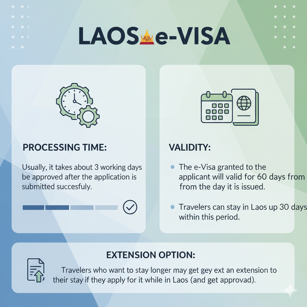 Validity: The e-Visa granted to the applicant will be valid for 60 days from the day it is issued. Travelers can stay in Laos up to 30 days within this period.