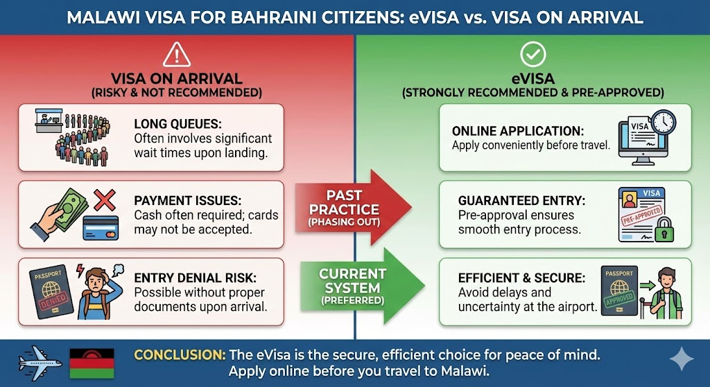 For Bahraini citizens, we strongly recommend obtaining the eVisa before travel. Relying on a Visa on Arrival can be risky; you may face long queues, payment issues (cash is often required), or even denial of entry if you lack the proper supporting documents upon landing at Lilongwe (LLW) or Blantyre (BLZ) airports. The eVisa guarantees your entry is pre-approved.