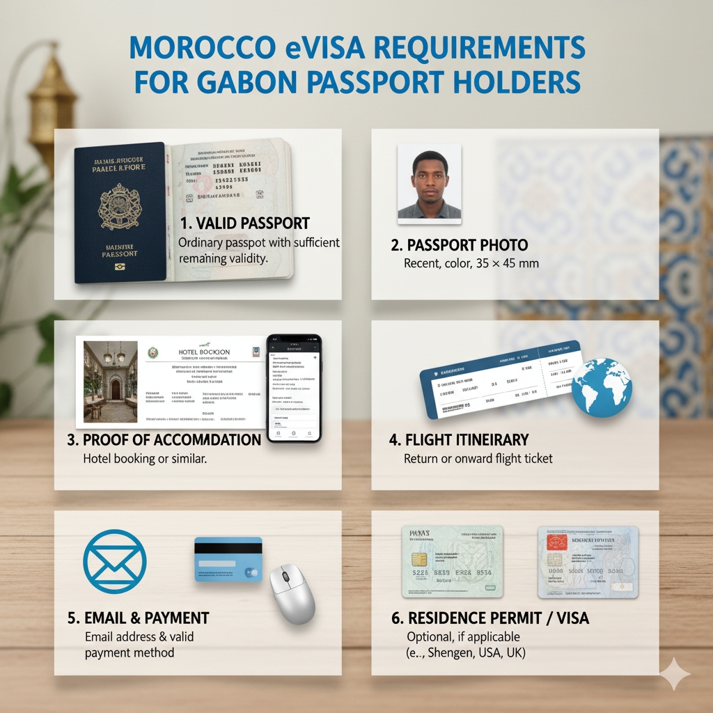 Documents needed for Morocco eVisa from Gabon passport, here are the common documents and criteria: