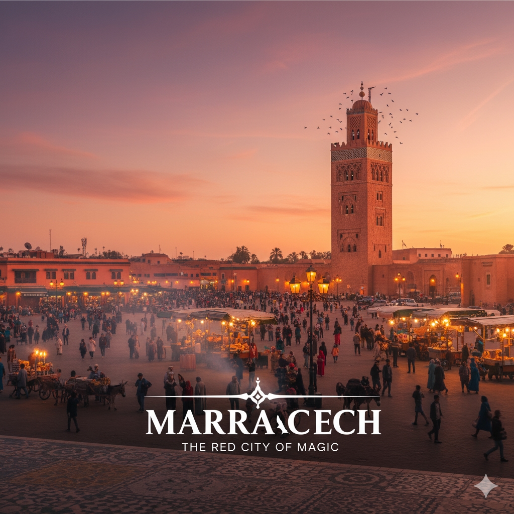 A vibrant city, full of colour, markets (souks), gardens, historic palaces, and night-life in the medina (old city).