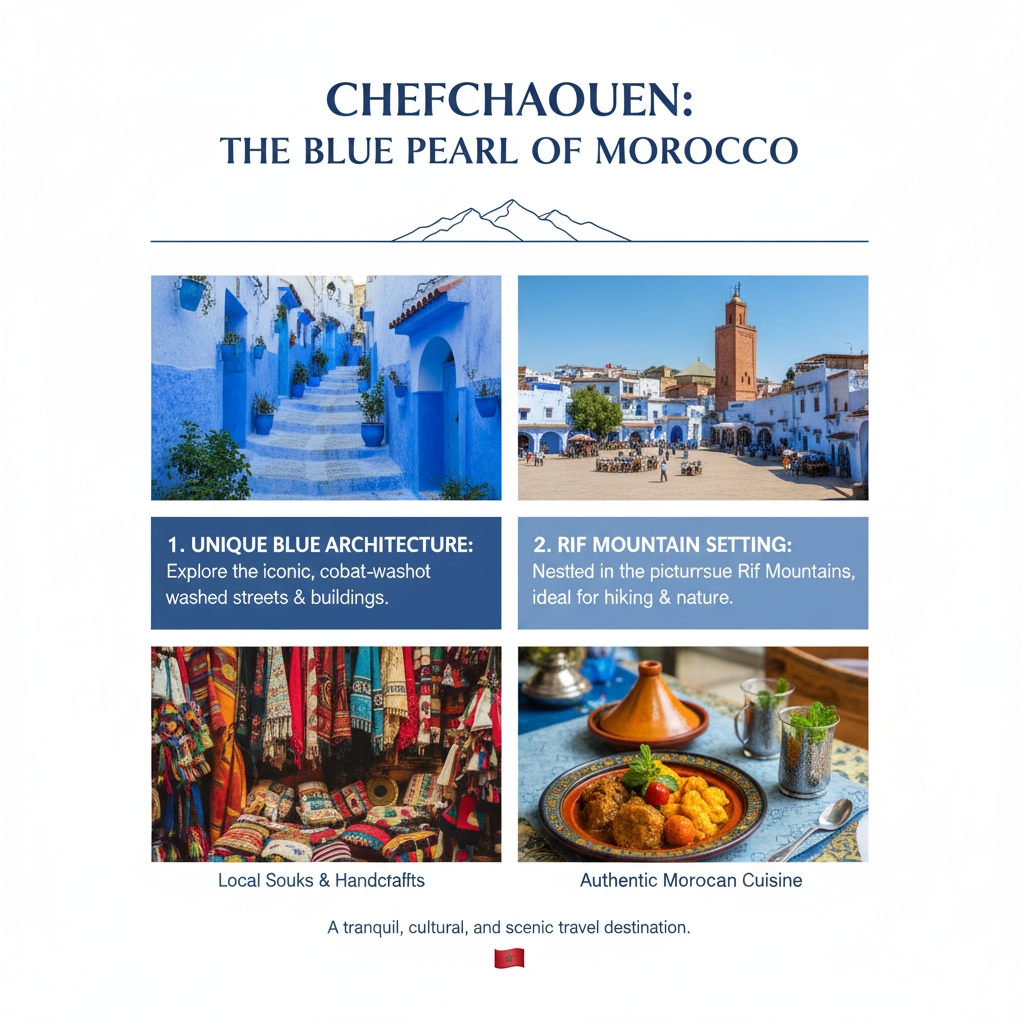 Famous âBlue Cityâ in the Rif Mountains â incredibly photogenic with blue-painted lanes and a laid-back vibe.