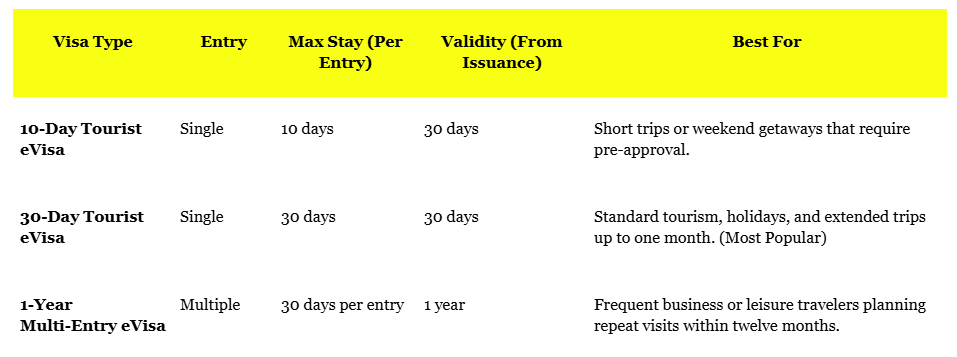 - Layover over 72 hours: You must apply for a standard 10-Day or 30-Day Tourist eVisa in advance.