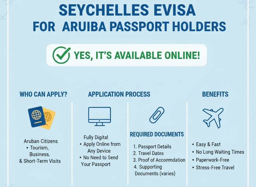Aruban citizens can apply online for a Seychelles eVisa for tourism, business, or short-term visits. The application process is fully digital and accessible from any device. You will need to provide your passport details, travel dates, accommodation proof, and a few supporting documents.