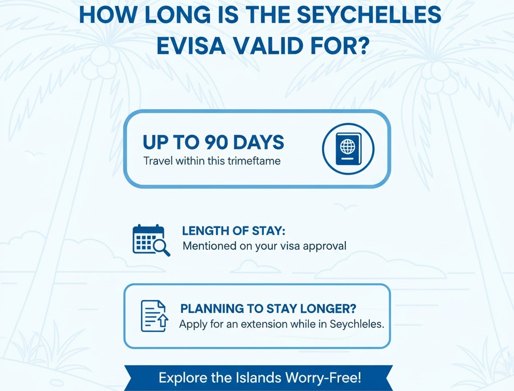 Usually, a Seychelles eVisa is valid for up to 90 days. You must travel within that time frame. The length of your stay in Seychelles will be mentioned on your visa approval.