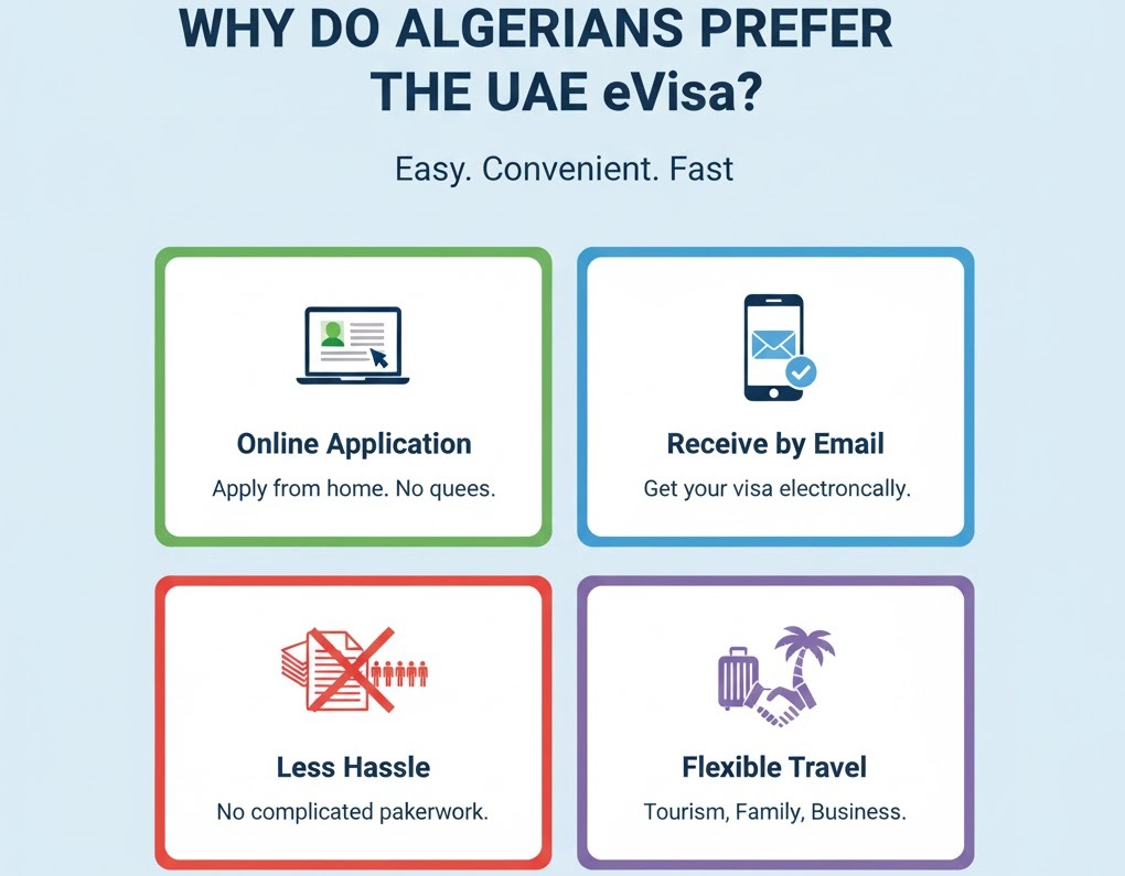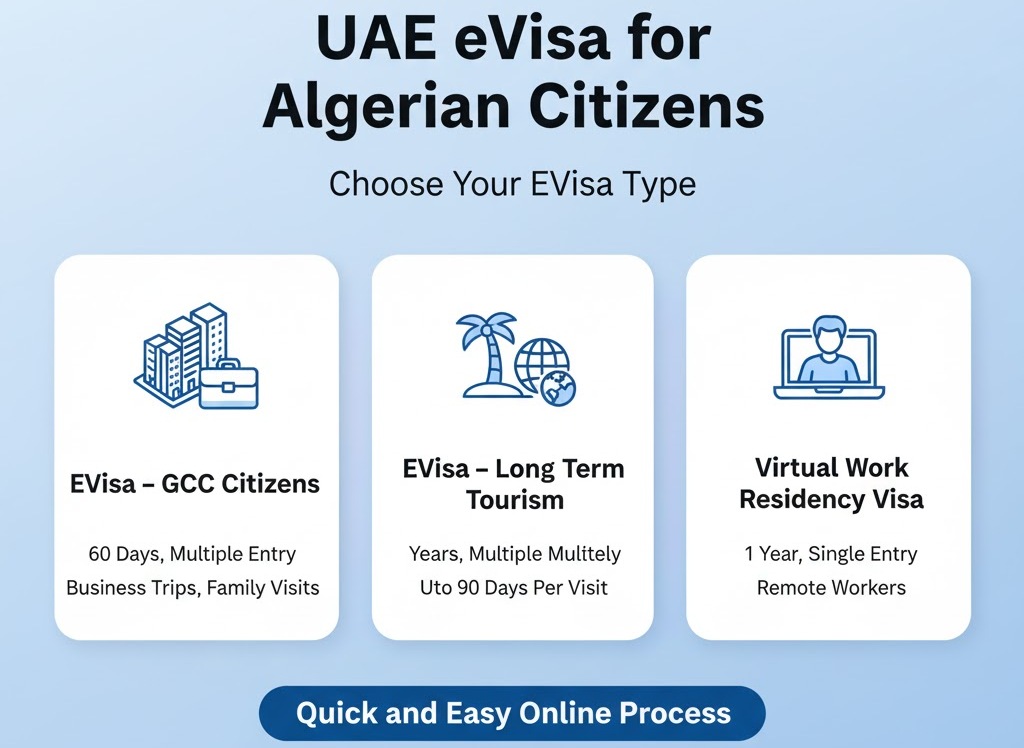 Each UAE eVisa type helps Algerian travelers choose the best option based on their travel purpose, tourism, work, or frequent visits, all through a quick and easy online process.