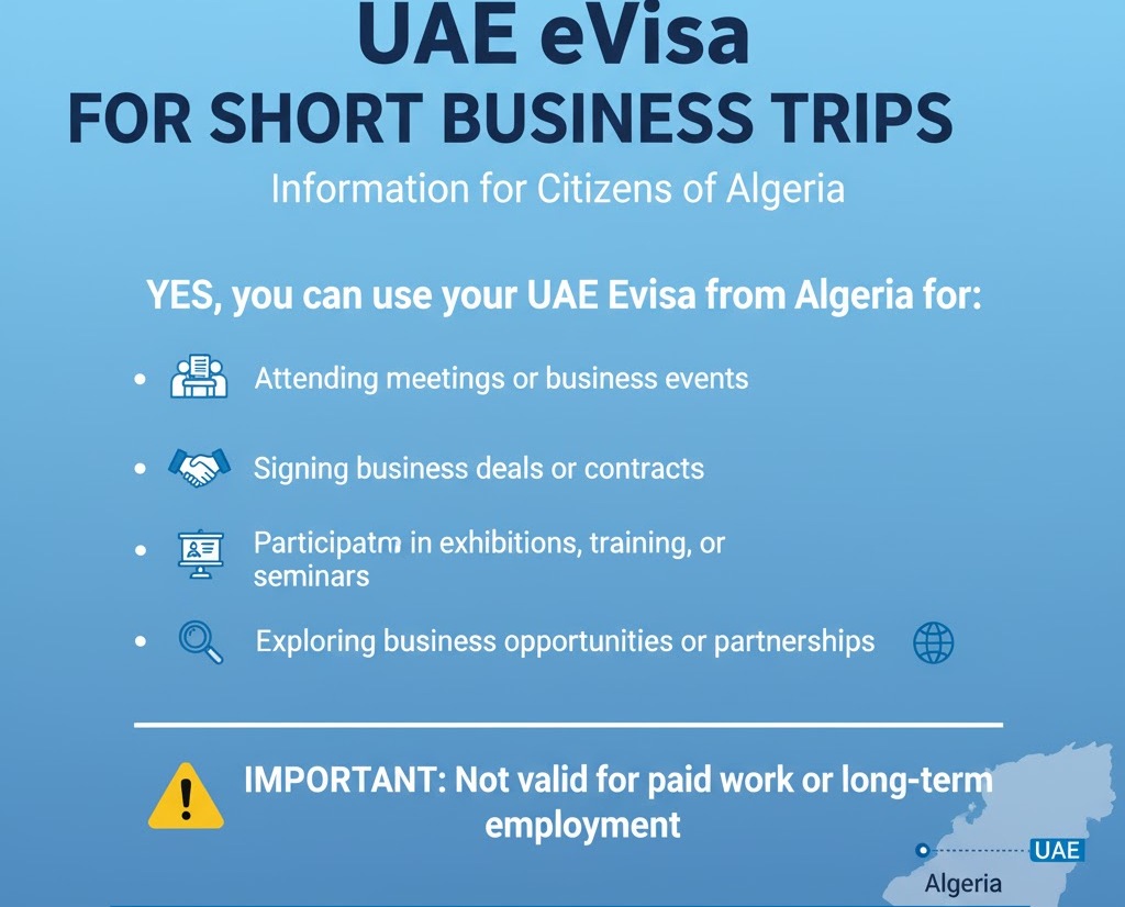 Yes, you can use your UAE eVisa for short business trips from Algeria. Many Algerian travelers apply for this visa when attending conferences, meetings, or trade exhibitions in the UAE. The eVisa is ideal for short-term business activities, but it does not allow full-time work or long-term contracts.