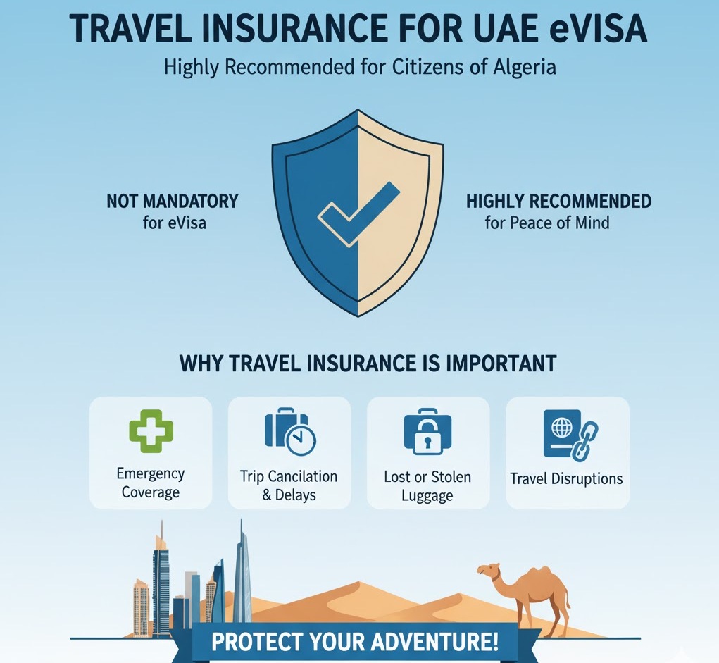 While travel insurance is not mandatory for the UAE eVisa, it is highly recommended, especially for travelers from Algeria. It protects you in case of medical emergencies, lost baggage, or flight cancellations during your stay.