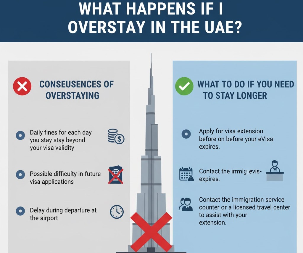 If you overstay your UAE eVisa, you may face penalties or fines. The UAE takes visa compliance seriously, and overstaying can affect future travel plans.
