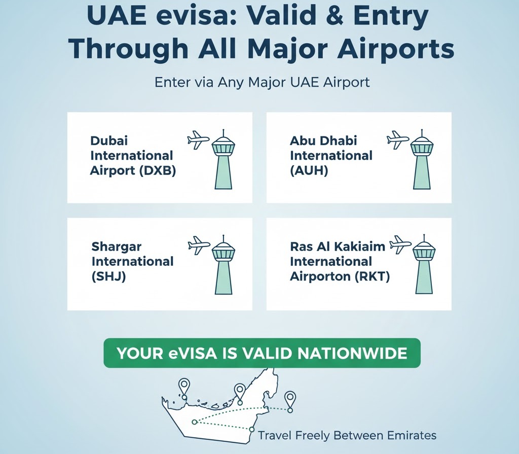 Yes, your eVisa is valid for entry through all major UAE airports, including: