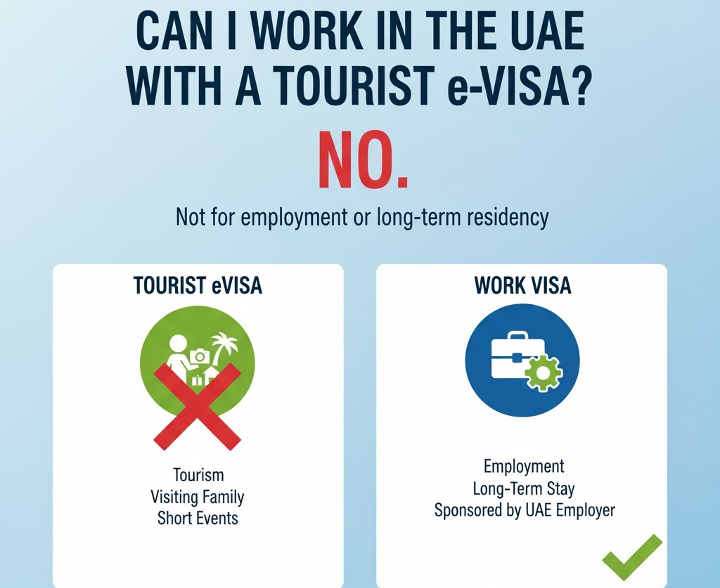 No, you cannot work in the UAE with a tourist eVisa. This visa is meant for tourism, visiting family, or attending short events, not for taking up employment.