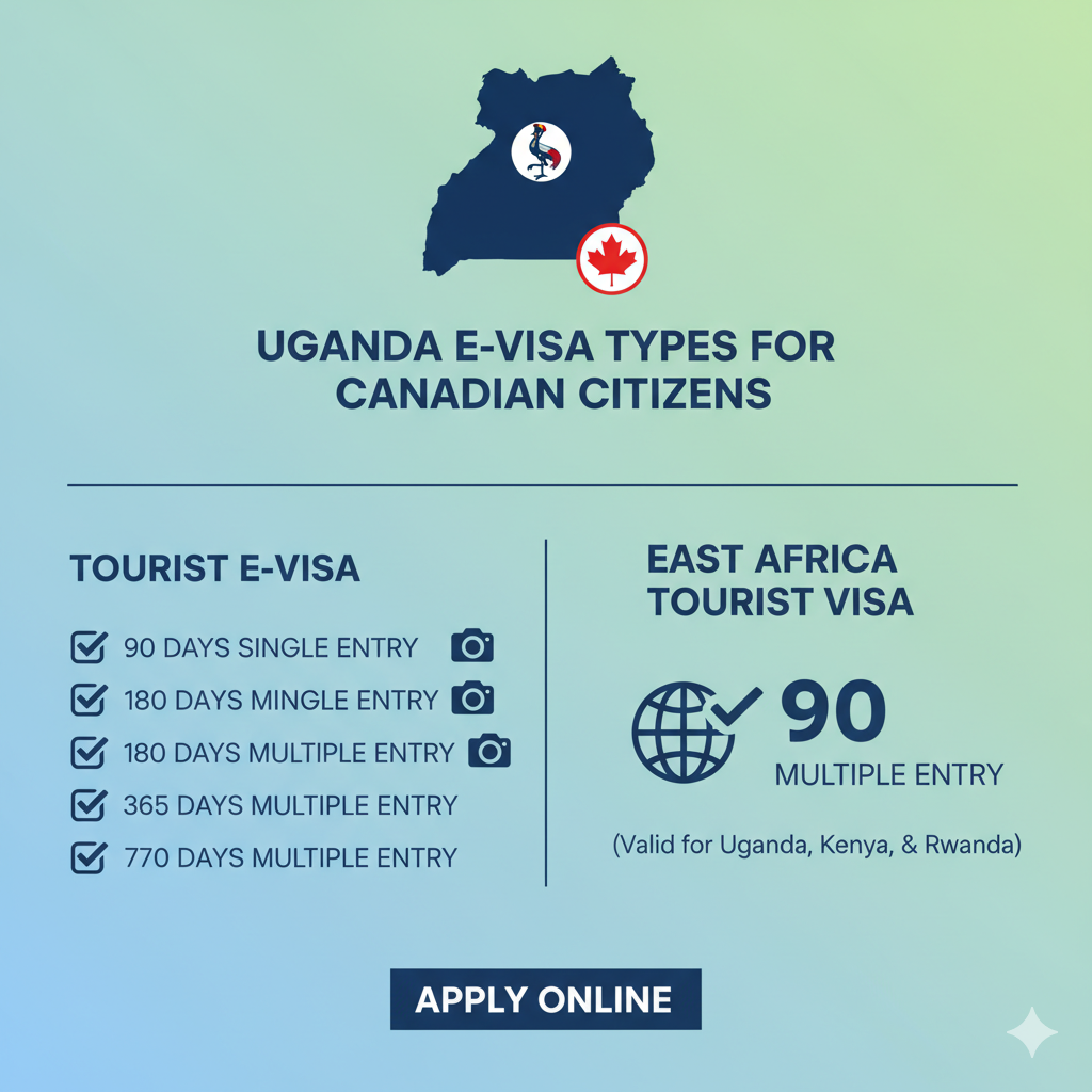 According to the official reference, Canadian citizens can apply for the following Uganda e-Visa categories: