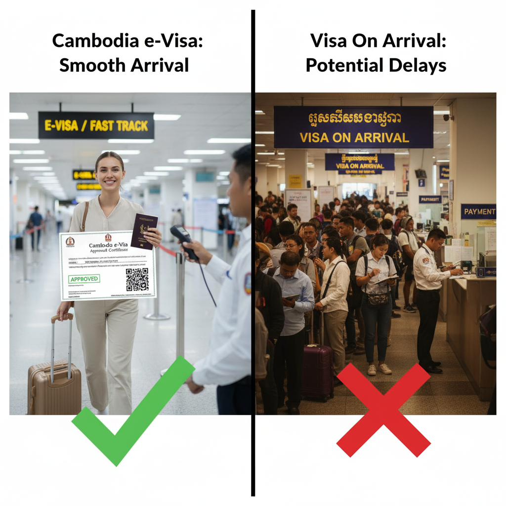 If youââ¬â¢re planning aheadââ¬âas most of us do for a trip to Cambodiaââ¬âI strongly recommend using the Cambodia e-Visa. It removes uncertainty and saves you time on arrival. The only scenario where visa on arrival might make sense is if you're arriving by land border spontaneously or in a pinch. Reddit travellers report that the difference may only be 10-15 minutes at the airport, but the e-Visa still gives you the calm-factor of knowing you are covered ahead of time.
