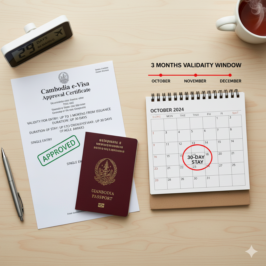 To recap: the validity means the period during which you must enter Cambodia. Once you enter, the stay duration is measured from that entry. The details: up to 3 months validity to enter, then stay up to 1 month (30 days) inside the country.
