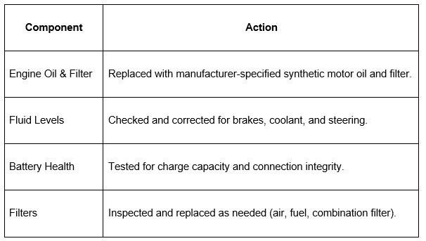 During a standard service, a technician will perform a thorough inspection. This includes changing the synthetic motor oil and filter, which is vital for engine lubrication and cooling. Fresh oil prevents friction and wear, helping your engine run more efficiently and last longer. Without this, old, dirty oil can lead to significant engine damage.