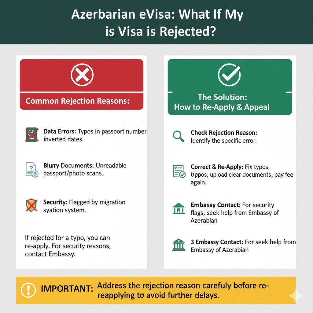 - Security: Flagged by the migration system. If rejected for a typo, you can usually re-apply. If rejected for security reasons, you may need to contact the nearest Embassy of Azerbaijan.