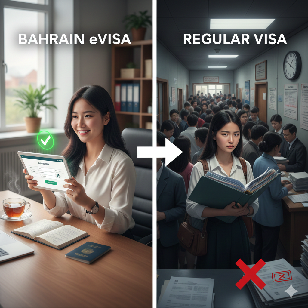 Bahrain eVisa is an online visa application that is significantly faster and easier than even making an application of a standard visa. You do not need to visit an interview, present documents physically, or wait days and weeks to be processed with an eVisa.