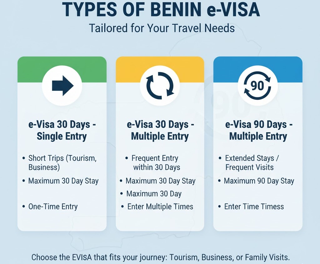 e-Visa 30 days -Multiple Entry: This is the better option for visitors that need to enter Benin a single time, but multiple times, within a 30 day time period.