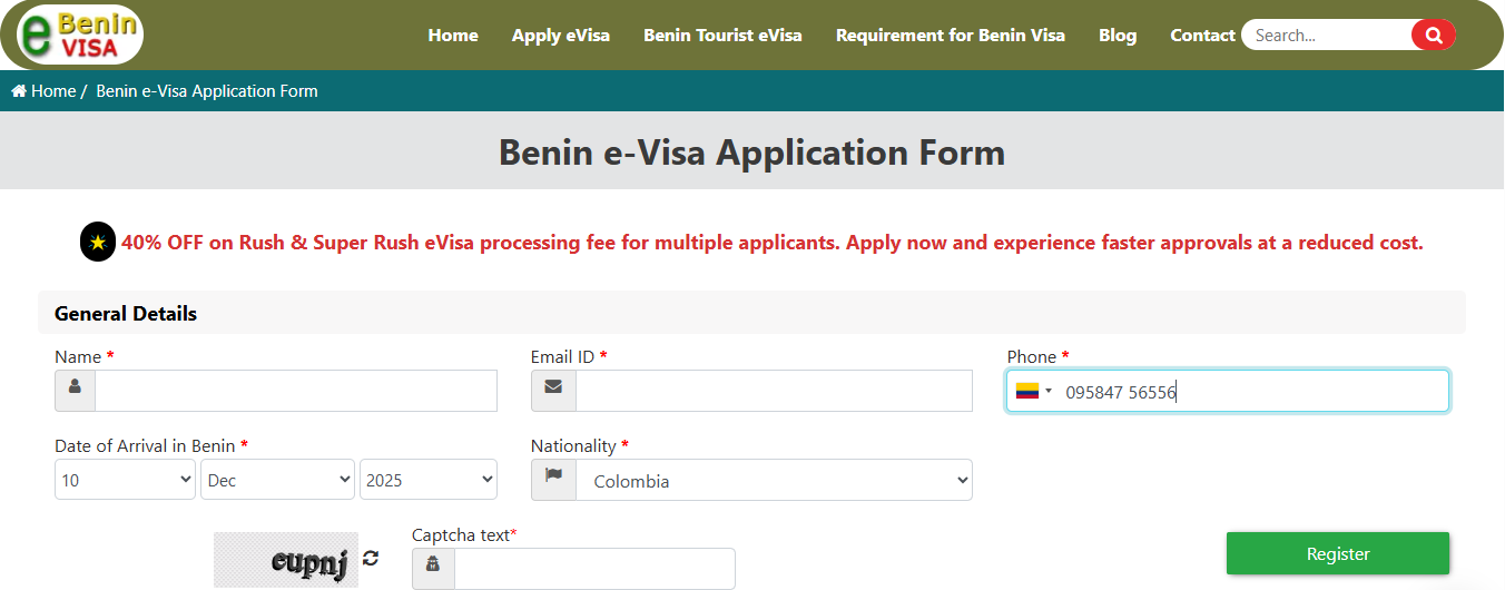 The Benin eVisa from Colombia process is completely electronic and designed to be user-friendly, allowing you to complete your travel authorization from anywhere in the world. Here is a general outline of the procedure: