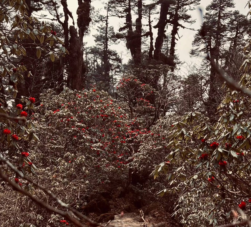 Spring transforms the forest sections into vibrant corridors of oak and rhododendron. The red blooms contrast sharply against snow-capped summits. The trail remains moderately challenging due to altitude gain, so trekkers should prepare well.
