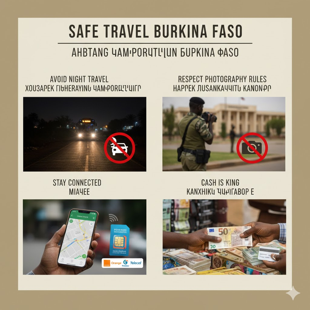 - Cash is King: Credit cards are rarely accepted outside major hotels in Ouagadougou. Carry sufficient Cash (Euros are easiest to exchange for CFA Francs).