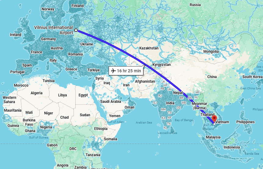 Be prepared for a long travel day. There are no direct flights from Lithuania (e.g., Vilnius) to Cambodia (e.g., Phnom Penh or Siem Reap).