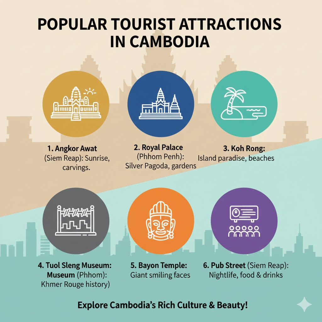 - Airports: Phnom Penh (PNH/KTI), Siem Reap (SAI), Sihanoukville (KOS).