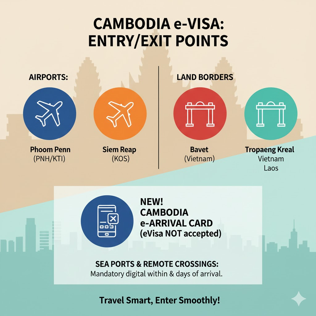 - e-Arrival Card: As of 2024, all travelers must also complete the "Cambodia e-Arrival" card (CeA) within 7 days of arrival. This is a digital customs/health declaration separate from the visa.