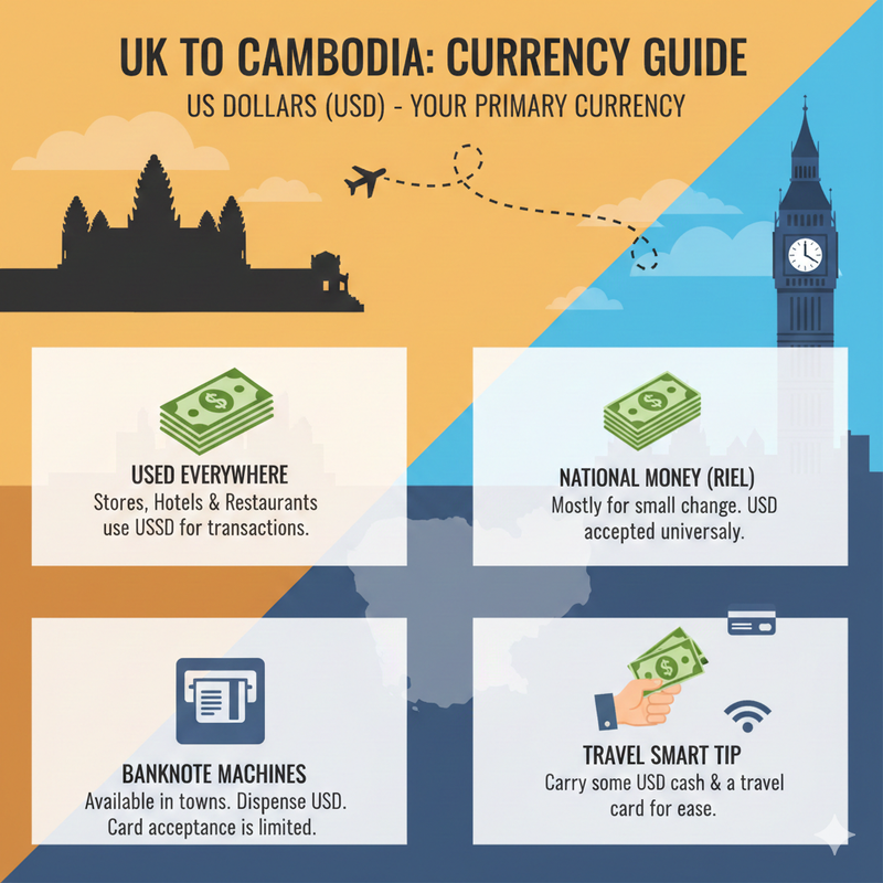 The best currency to take to Cambodia from the UK is US Dollars (USD).