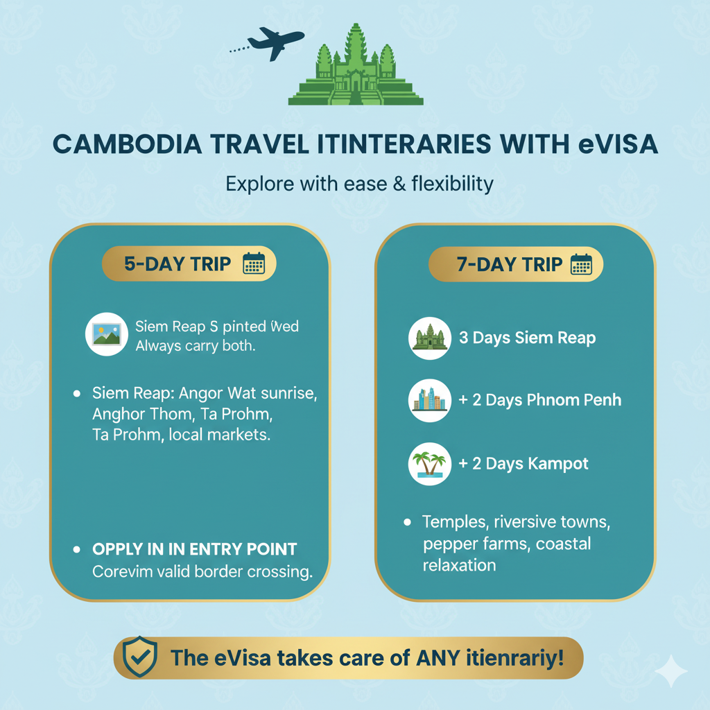 5-Day Trip â Siem Reap: Angkor Wat sunrise, Angkor Thom, Ta Prohm, local markets.7-Day Trip 3-Day Trip Siem Reap + Phnom Penh + Kampot: Temples, riverside towns, pepper farms, coastal relaxation.