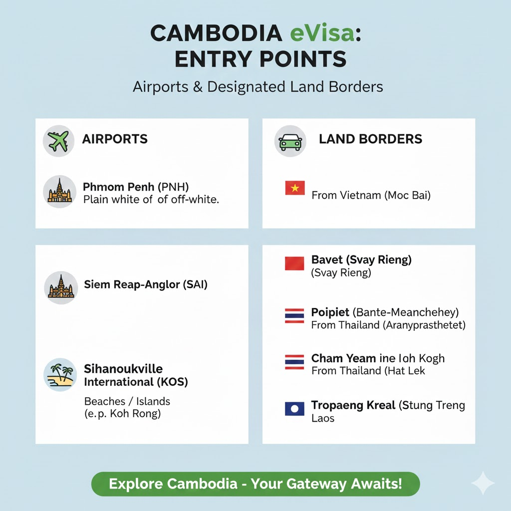While Phnom Penh (PNH) and the new Siem Reap-Angkor (SAI) airports are the most popular entry points, eVisa holders can also enter via: