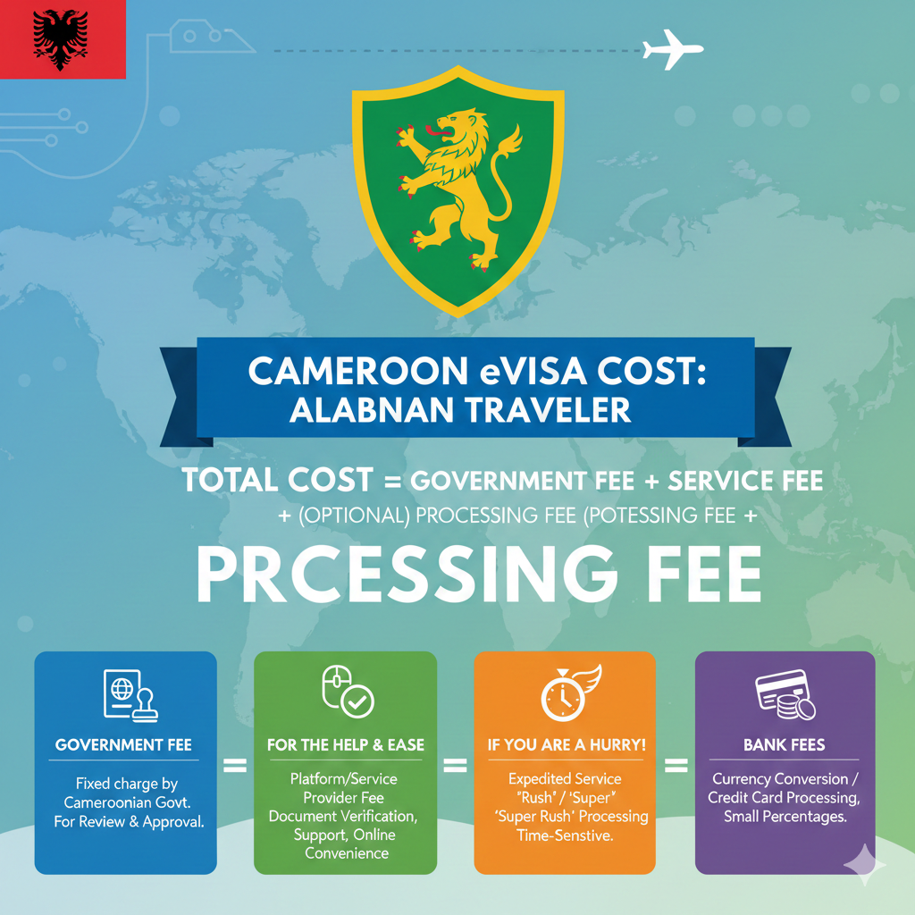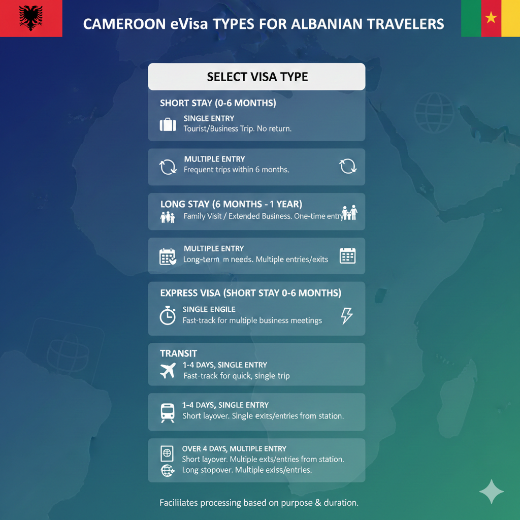 In case Albanian travellers need a Cameroon emergency visa with urgent travel needs, the "Express Visa" options (both Single and Multiple entry for Short Stay) and the "Super Rush Processing" speed are the means by which the application is made fast.