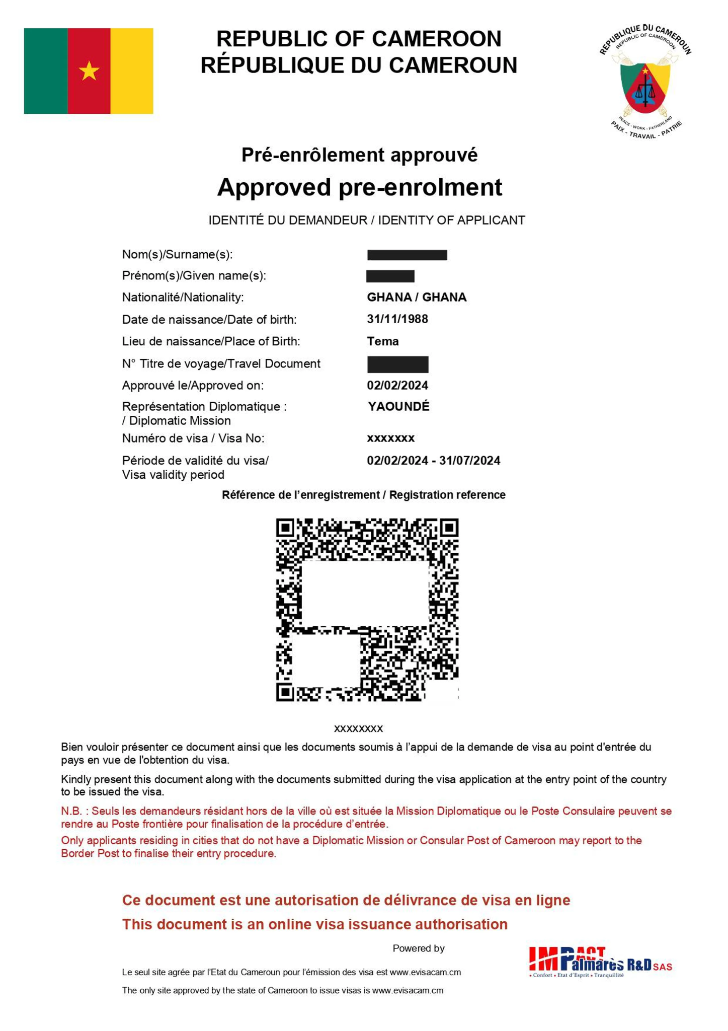 When applying online for an eVisa, you will receive an email indicating your travel authorization. When you arrive at either Douala or Yaoundé airports, you need to go to the "eVisa" or "Biometric" counter.