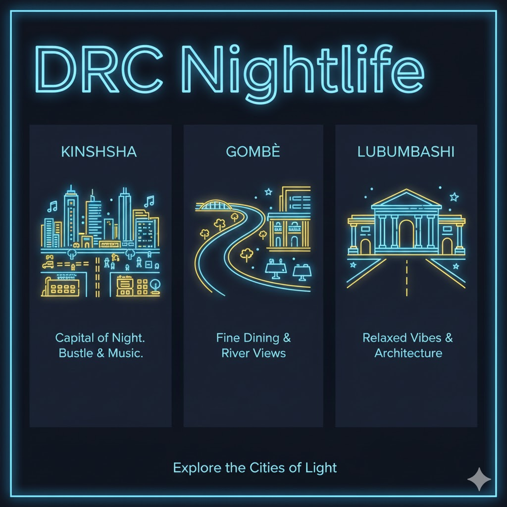 To people who like the night time city life with its flair and bustle, Kinshasa is the capital of the night and evening scene. Other places such as Gombe include fine dining and light settling scenery of the Congo River. Another good alternative is Lubumbashi which offers a safer and more relaxed evening vibe and has beautiful architecture, which is gorgeous at night and looks exquisite in the night lights.