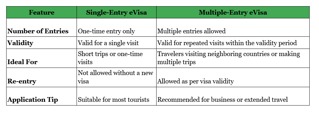 Understanding the difference between single-entry and multiple-entry Djibouti eVisas is important for planning your travel. The type of eVisa you choose affects how many times you can enter the country during its validity period.