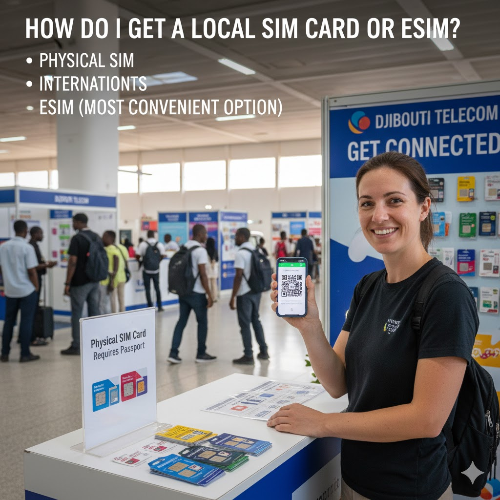 - Physical SIM: A SIM card can be purchased at the Airport or in the city at the Djibouti Telecom (the principal provider). Registration shall require you to have a passport.