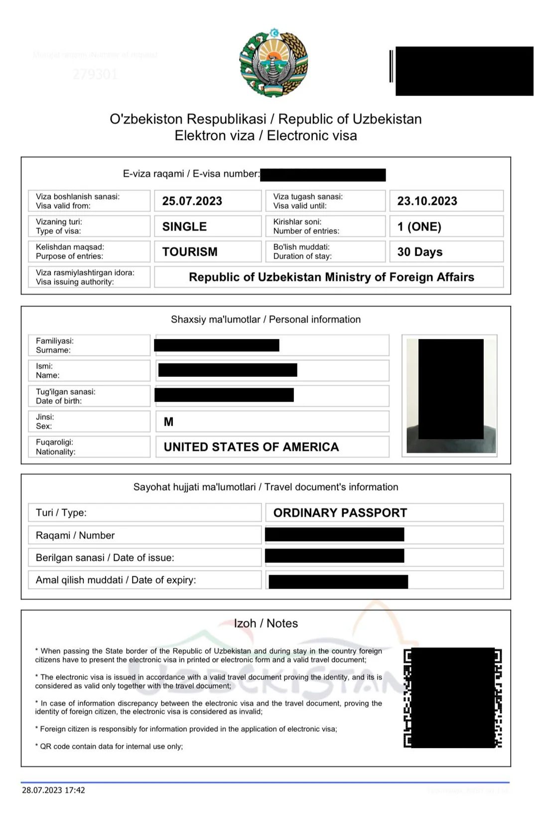 Once approved, the visa is sent directly to your email as a PDF. You must print this out and carry it with you to show at passport control in Tashkent.