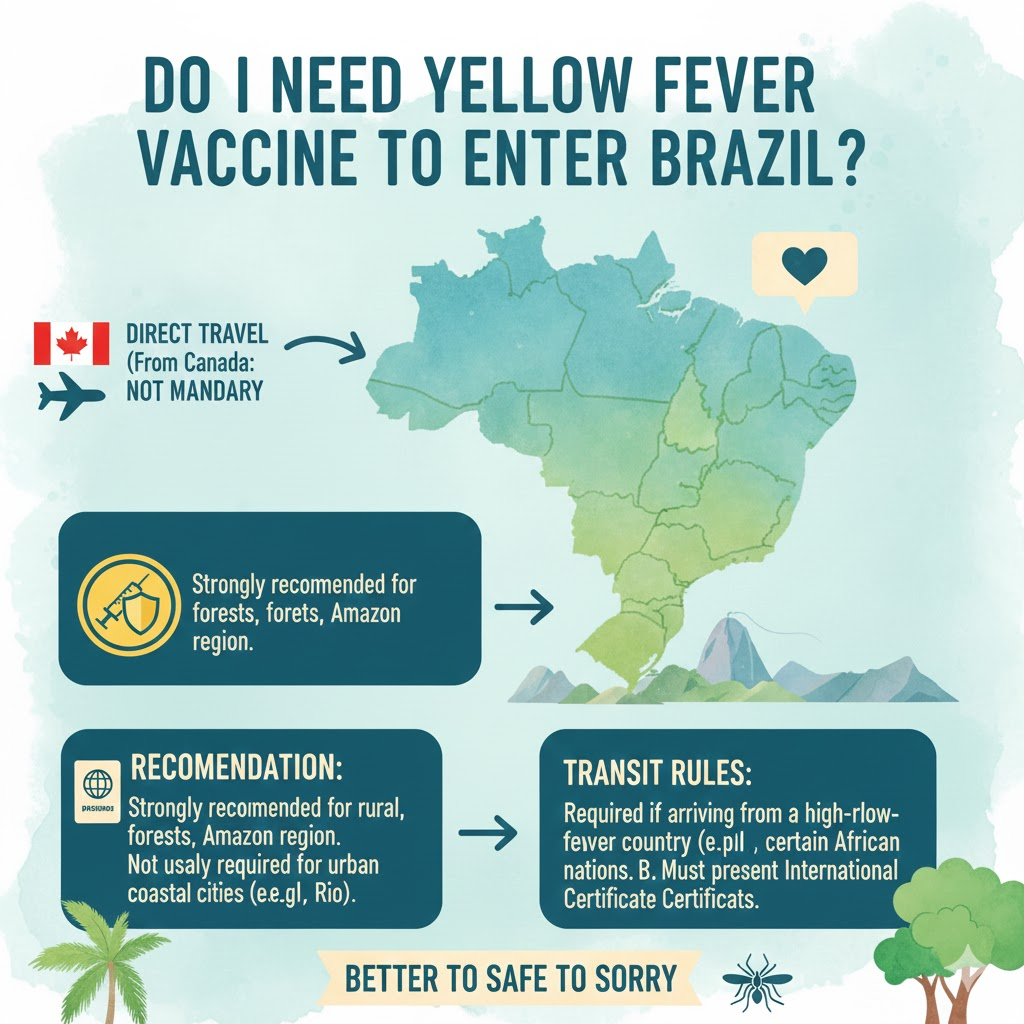 - Recommendation: The Brazilian Ministry of Health and Canadian travel health clinics strongly recommend the vaccine if you plan to visit rural areas, forests, or the Amazon region. It is generally not required for staying strictly in urban coastal cities like Rio de Janeiro, but it is better to be safe than sorry.