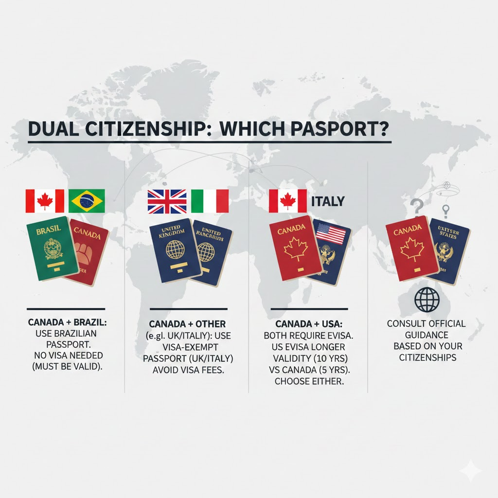 - Canada + Brazil: If you are a dual citizen of Canada and Brazil, you cannot apply for an eVisa. By law, Brazilian citizens must enter and exit the country using their Brazilian passport. You do not need a visa, but you must ensure your Brazilian passport is valid.