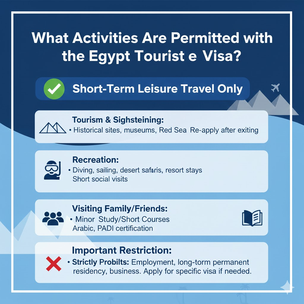 Important Restriction: The Tourist eVisa strictly prohibits any form of employment, long-term education (like enrolling in a university semester), permanent residency, or starting a commercial business. If your intent is anything other than short-term tourism, you must apply for a specific visa type (e.g., Work or Student Visa) through an Egyptian embassy.