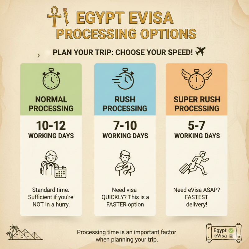 Processing time is an important factor when planning your trip. Egypt eVisa offers various processing options, allowing travelers to choose the most suitable option depending on their time period.�